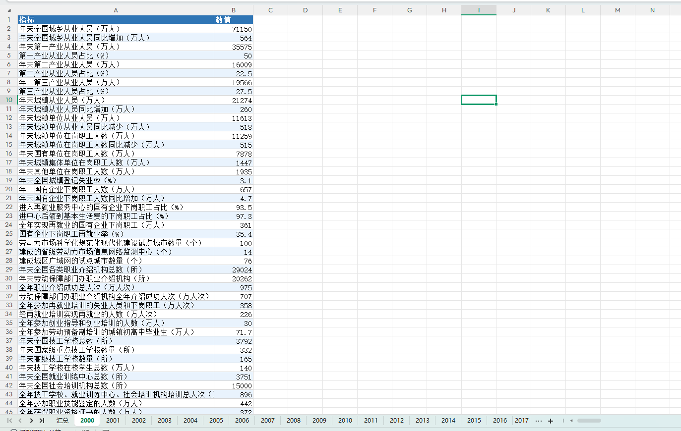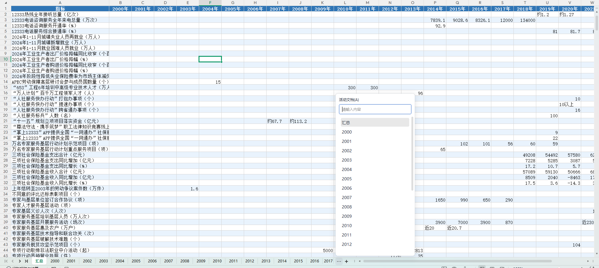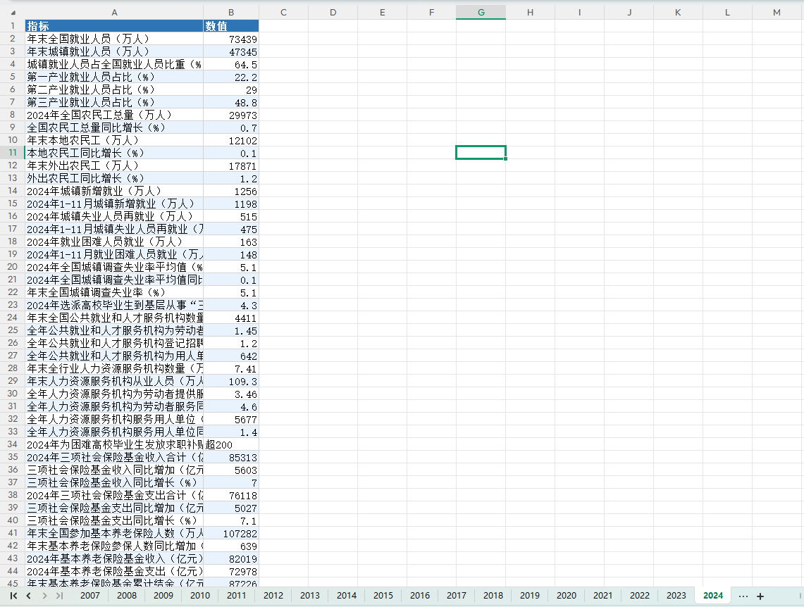 一、数据简介:本数据集系统整理了中国人力资源和社会保障部(原劳动和社会保障部)自2000年至2024年连续25年发布的年度《人力资源和社会保障事业发展统计公报》核心数据。作为中国政府在该领域的官方权威统计出版物,该数据集全面、连续地记录了中国在劳动就业、社会保障、收入分配等关键民生领域的发展历程与改革轨迹。