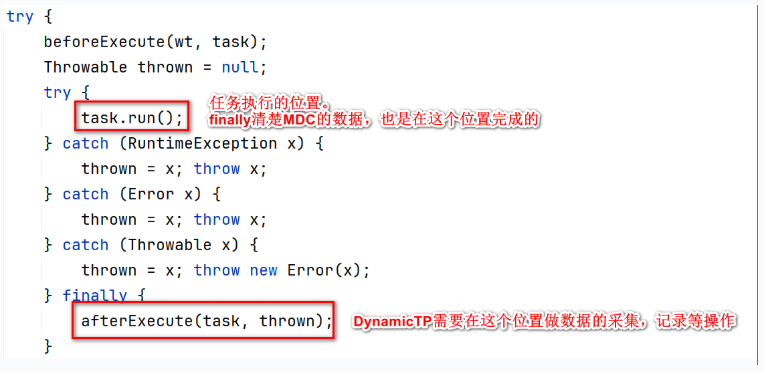 DynamicTP重写了线程池的 afterExecute 方法,在这个方法里需要记录一些日志,采集一些数据,这些过程涉及到了traceId,同时在 afterExecute 方法的最后,也会清除掉MDC里的traceId