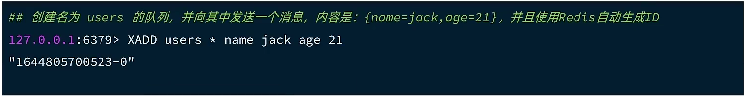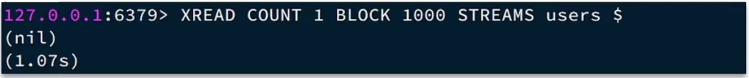 Object msg = redis.execute("XREAD COUNT 1 BLOCK 2000 STREAMS users $");
