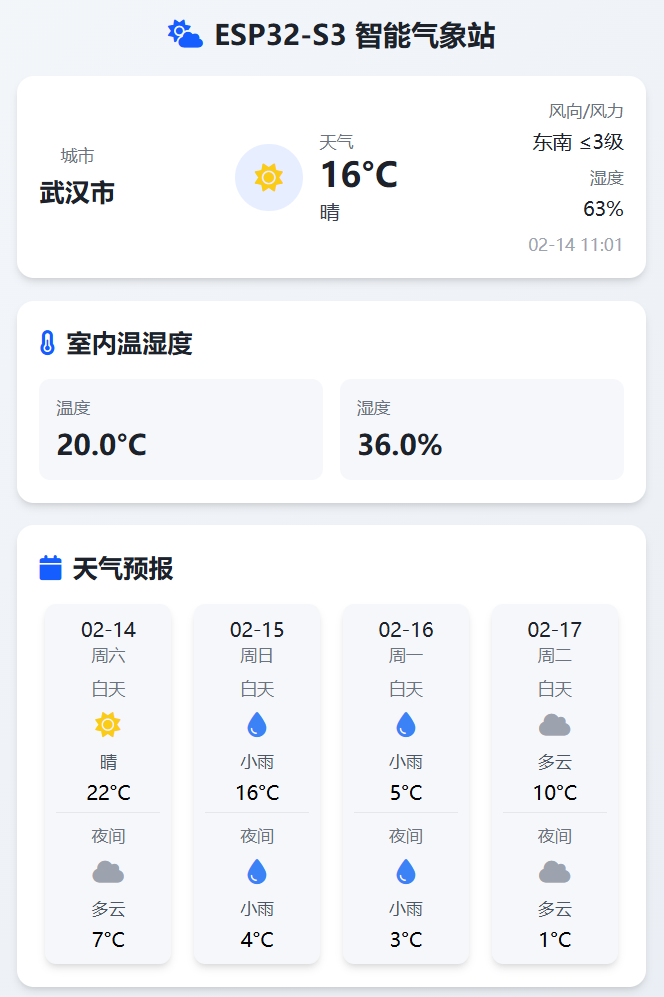 基于 ESP32-S3 开发的智能气象站系统,核心功能是:通过多种传感器采集室内环境数据(温湿度、烟雾浓度、光照强度),结合高德天气 API 获取室外实时 / 预报天气数据,通过 Web 界面可视化展示所有数据,并支持前端实时配置报警阈值、联动规则,同时实现烟雾超标蜂鸣器报警、光照联动 WS2812 LED 灯变色的硬件交互。