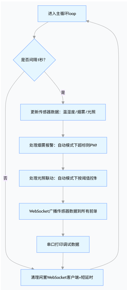 | 温湿度采集 | DHT11(引脚 13) | 每秒读取温度 / 湿度,异常值置 0 |