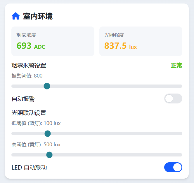- 配置区域:滑动条调整烟雾 / 光照阈值,开关控制自动报警 / LED 联动。