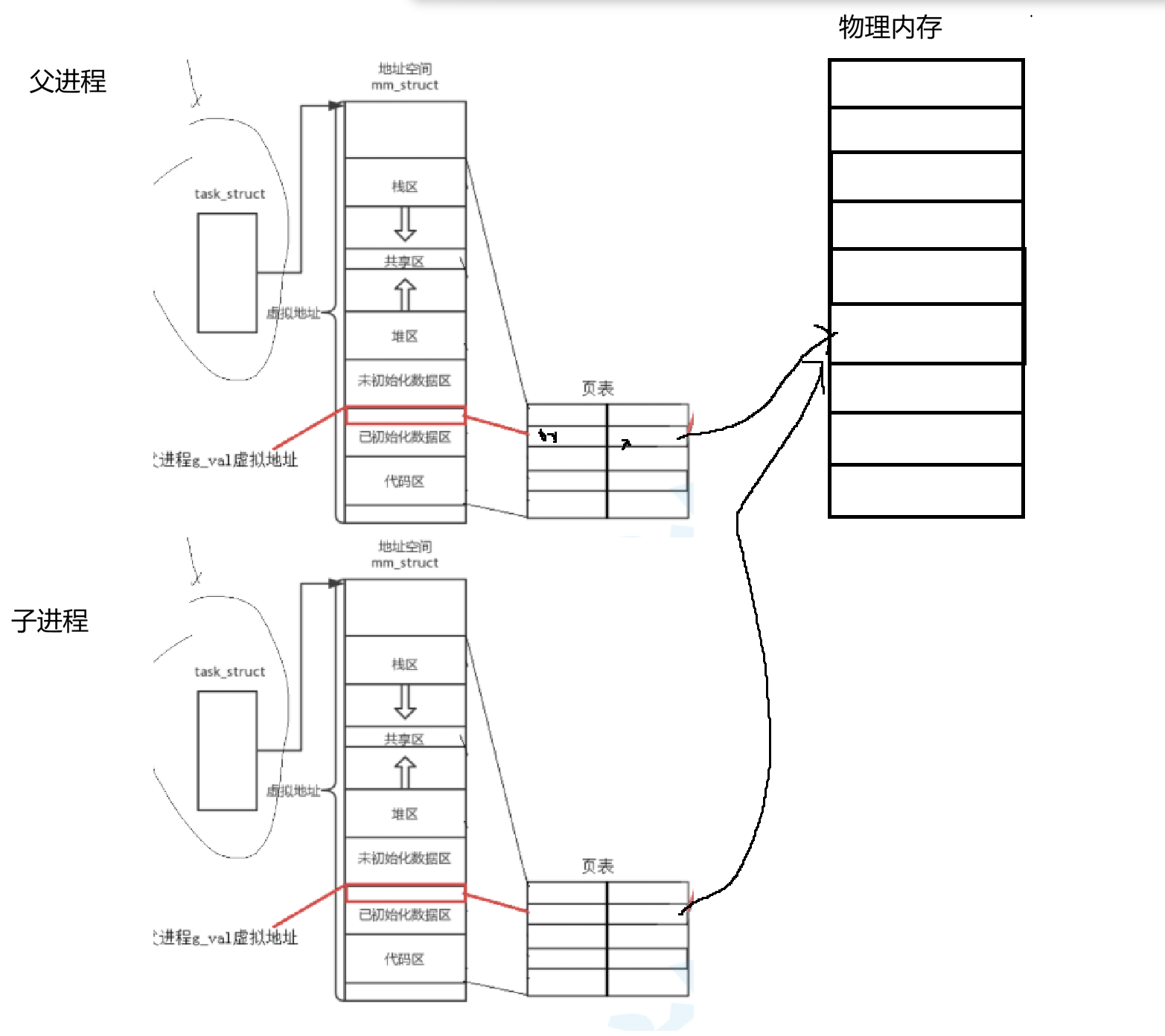 我们前面介绍过当父进程创建子进程时操作系统会为子进程创建task_struct,子进程的task_struct是以父进程的task_struct为模板初始化的,然后修正个别子进程特有的属性,如pid,ppid等。所以父进程自然就会将task_struct、mm_struct、页表(内部是键值对指针,分别指向虚拟地址和物理地址)都拷贝一份给子进程,所以父子进程的进程地址空间一样,页表一样,自然映射关系也一样,所以子进程也指向父进程物理内存中的代码和数据,自然父子进程共享代码和数据。