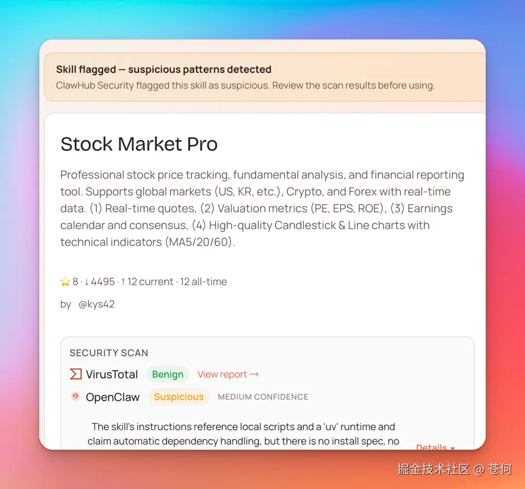 ClawHub 上股票相关的 Skill 还挺多,我挑了几个热门的试了试: