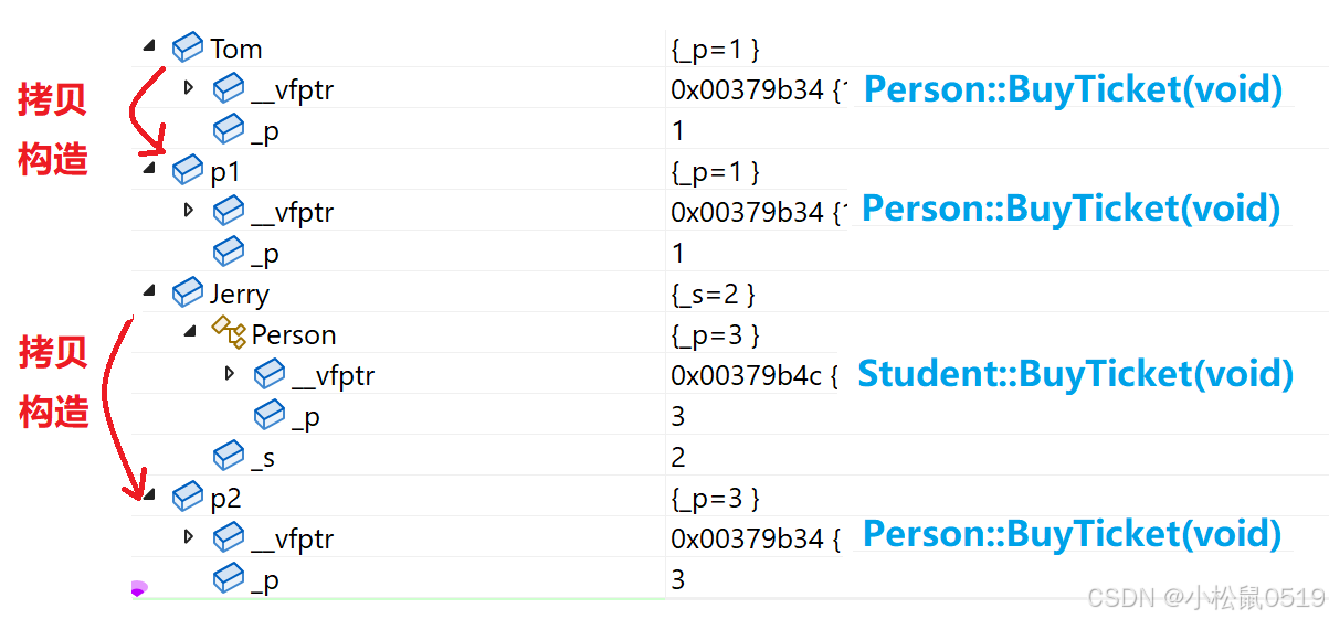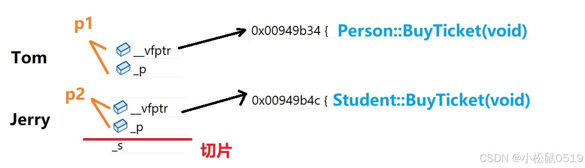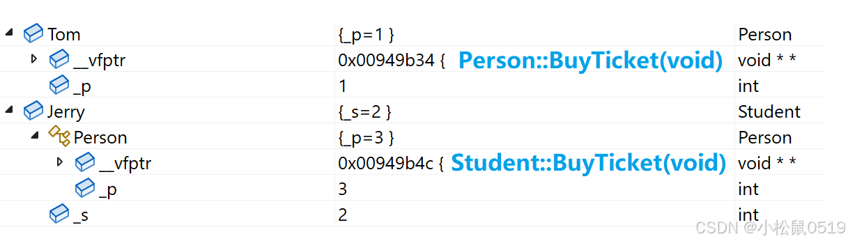 通过调试可以发现,对象Tom中包含一个成员变量_p和一个虚表指针,对象Jerry中包含两个成员变量_p和_s以及一个虚表指针,这两个对象当中的虚表指针分别指向自己的虚表。