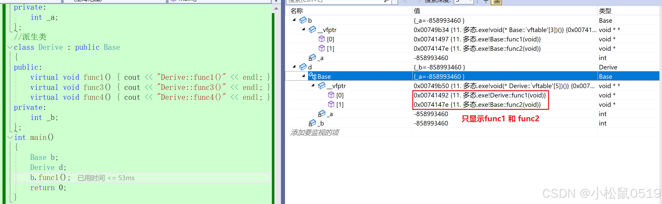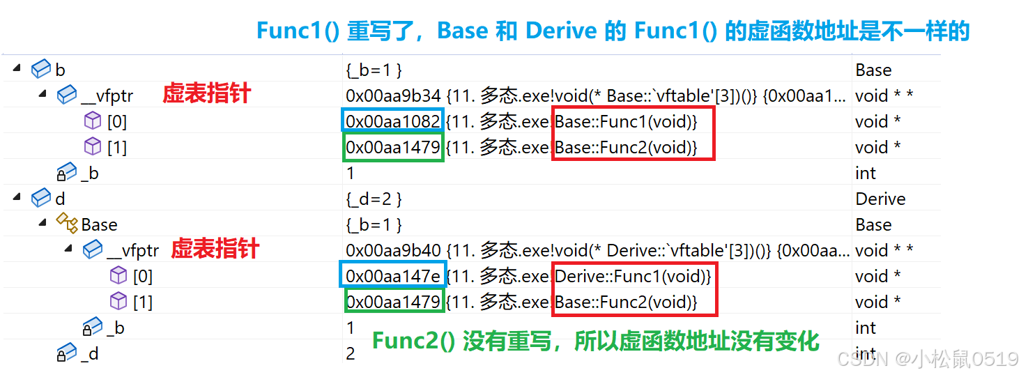 思路:取出b、d对象的头4bytes,就是虚表的指针,前面我们说了虚函数表本质是一个存虚