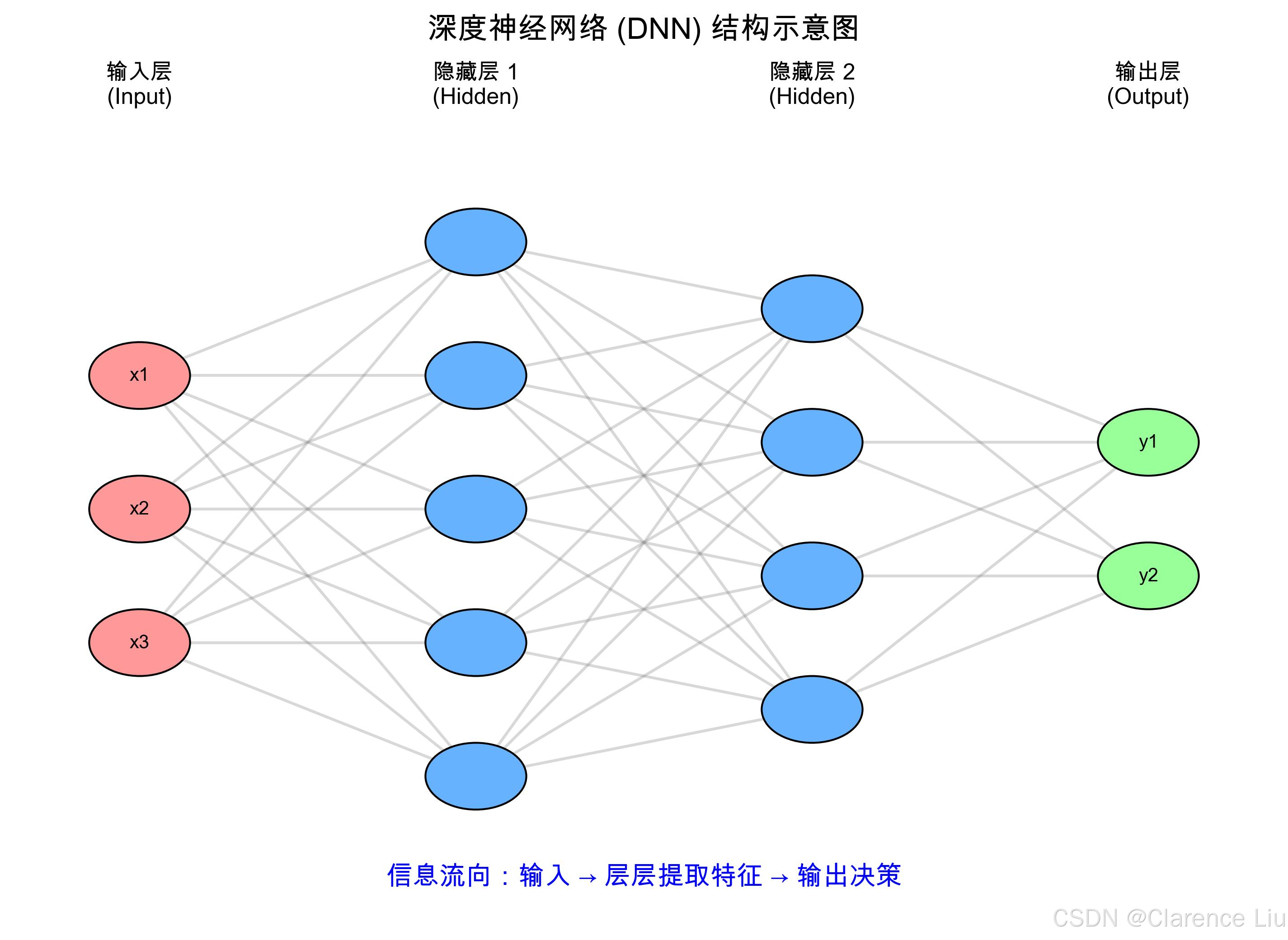 结构像千层饼,数据从输入层"喂"进去,一层一层向前传,直到输出层。