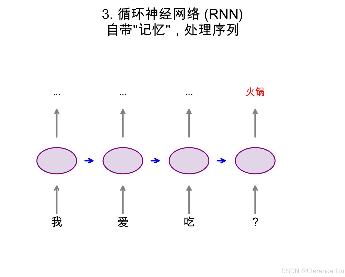 - 当你说"我爱吃..."时,RNN会根据"爱"和"吃"预测下一个词可能是"火锅"或"米饭"。