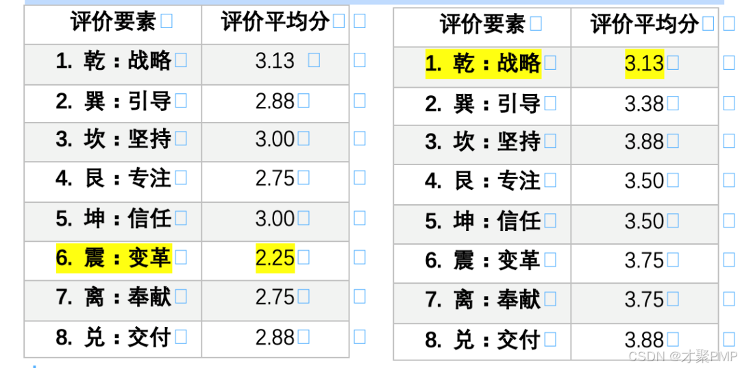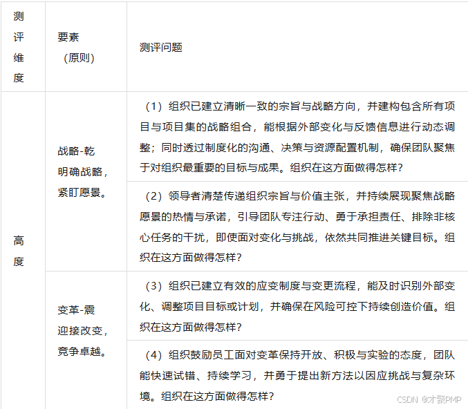 (1)高度战略与变革。高度强调项目的战略对齐、愿景引领、以及拥抱变革,包括"明确战略,紧盯愿景"与"迎接改变,竞争卓越" 两项原则。