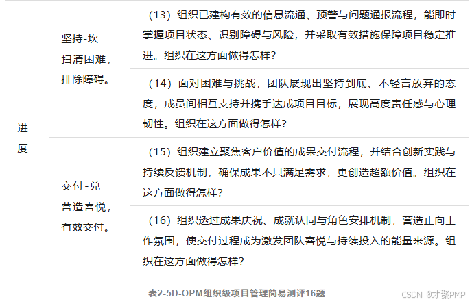 依据表1 "5D-OPM 主体框架(8项原则与易经基本8卦关系)",设计了一套双维度的测评问卷,参见表2。针对每一卦,设定了一个制度/方法(M)问题和一个能量/文化(E)问题,旨在通过"5D-OPM与易经基本卦"融合的评估视角,全面诊断组织在战略聚焦、文化承载、认知对齐、有效交付等关键领域的成熟度。表2"5D-OPM组织级项目管理简易评测16题",提供了简易测评16题。实际上,题目本身就包含项目管理在这一原则下应知应做的大致内容,可供分析、改进参考。