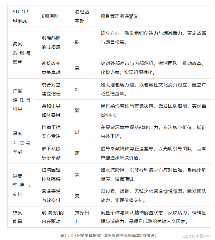 表1展示了5D-OPM 主体框架------项目管理5个维度,8项原则,与易经基本8卦对应的关系,将其作为实践应用时的"简易测评"依据。