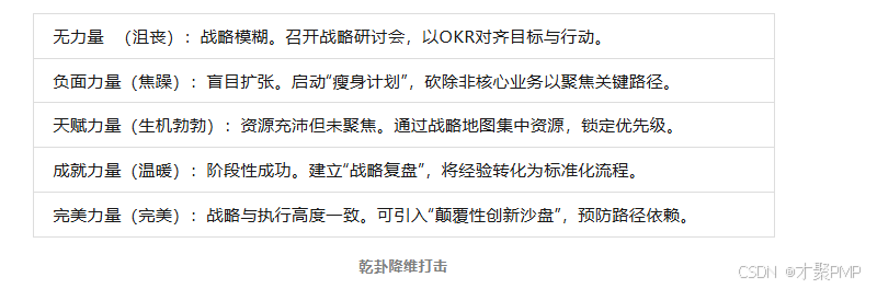 降维打击:是与"升维思考"配套的落地执行工具。针对项目在不同发展阶段可能出现的"无力量、负面力量、天赋力量、成就力量、完美力量"五种典型状态,提供精准、可操作的应对策略,将"升维思考"构建的系统性战略框架,也以乾卦为例,参见表"乾卦降维打击":