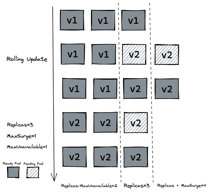 Deployment:定义应用如何更新和扩展,确保指定数量的 Pod 副本在任何时候都在运行。