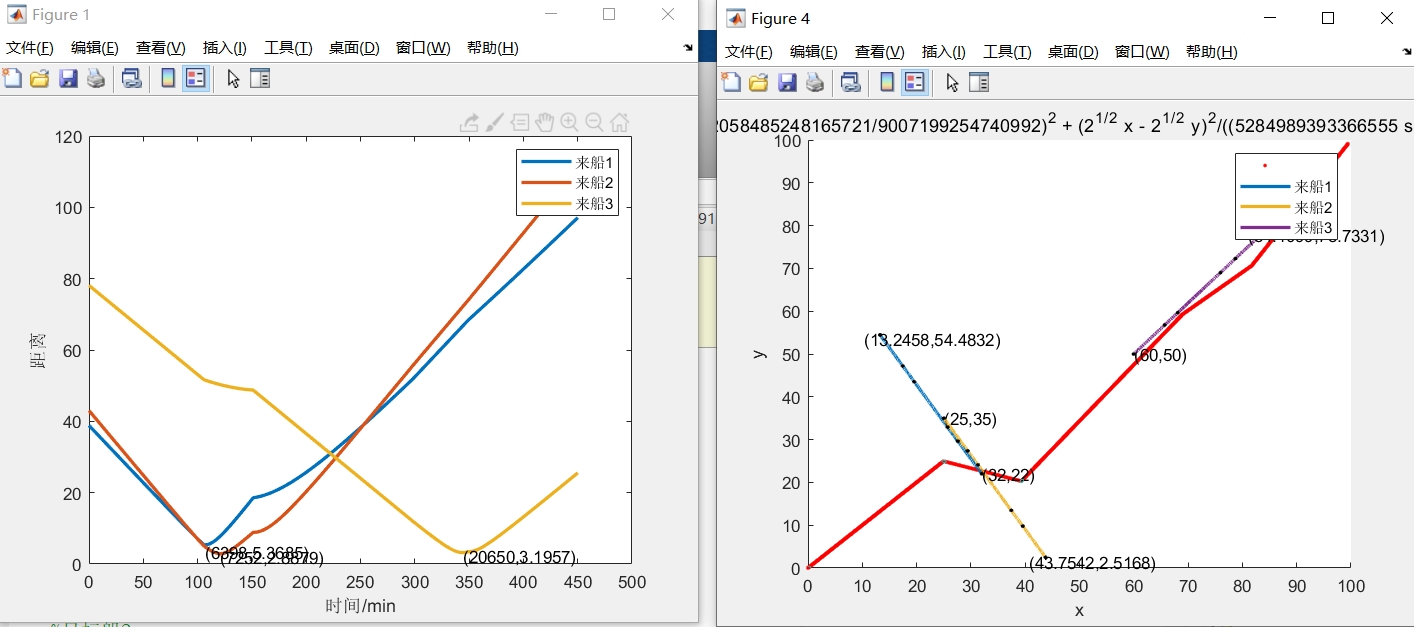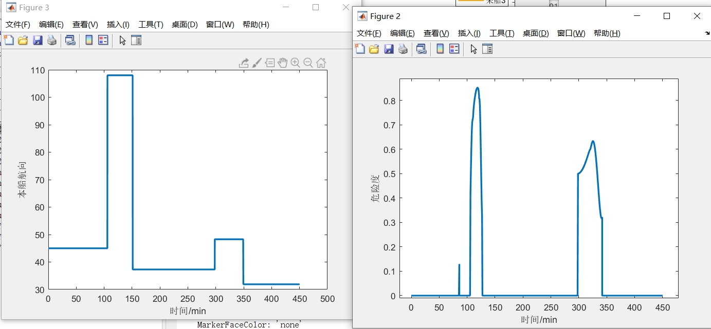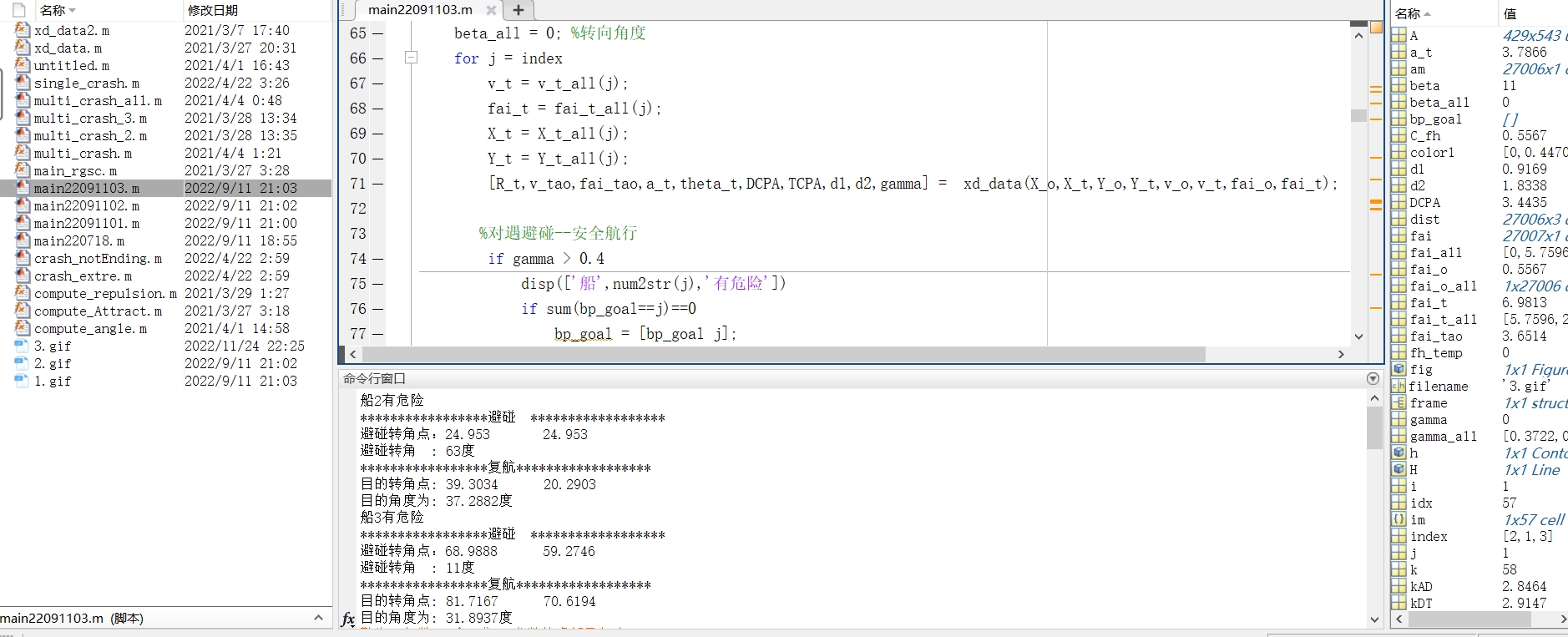 这部分代码用于生成船舶航行过程的gif动图。先创建图形窗口并设置坐标轴范围,标记出目标点和障碍物。然后随着船舶位置更新,依次绘制船舶位置并连线,每更新一次位置就抓取一帧画面,转换为索引图像后写入gif文件,最终生成动图直观展示船舶避碰过程。