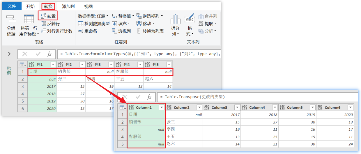 🔷再使用【转置】功能,将行与列转置,得到下图