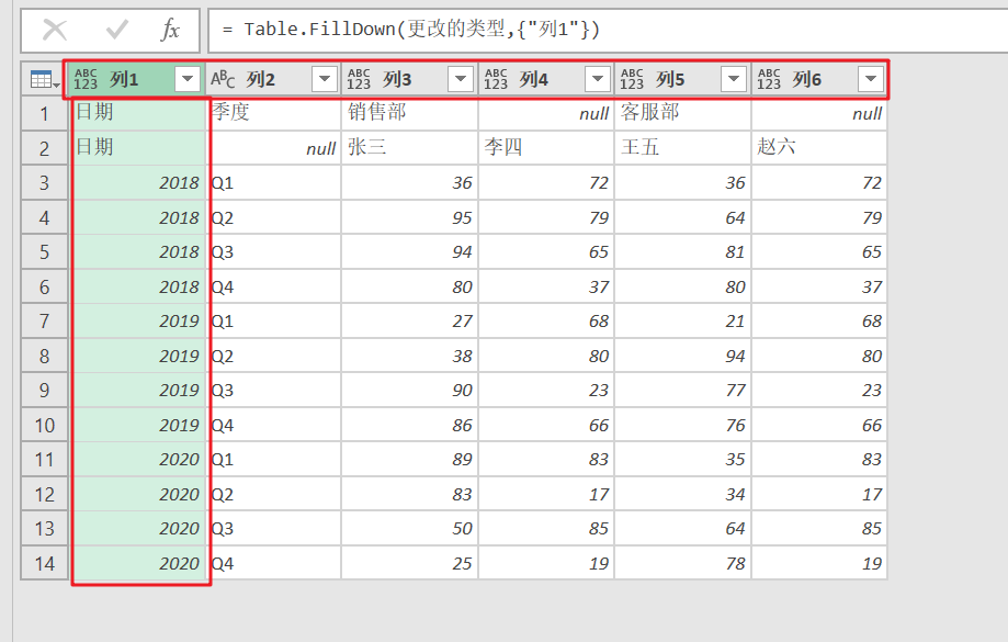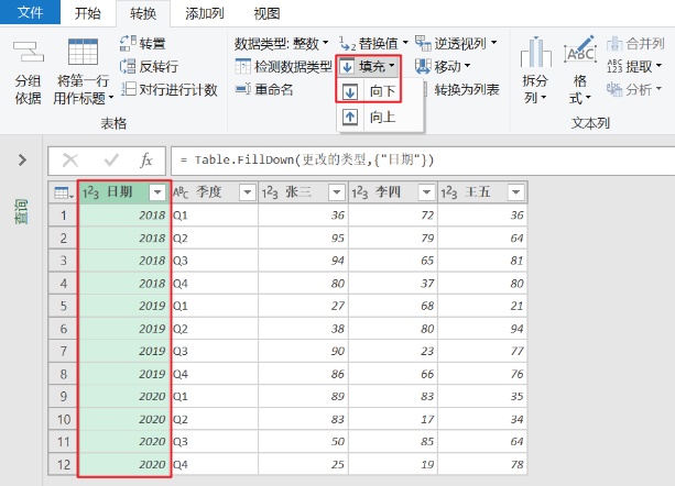 🔷使用【Power Query】打开表,然后把日期向下填充,得到下图