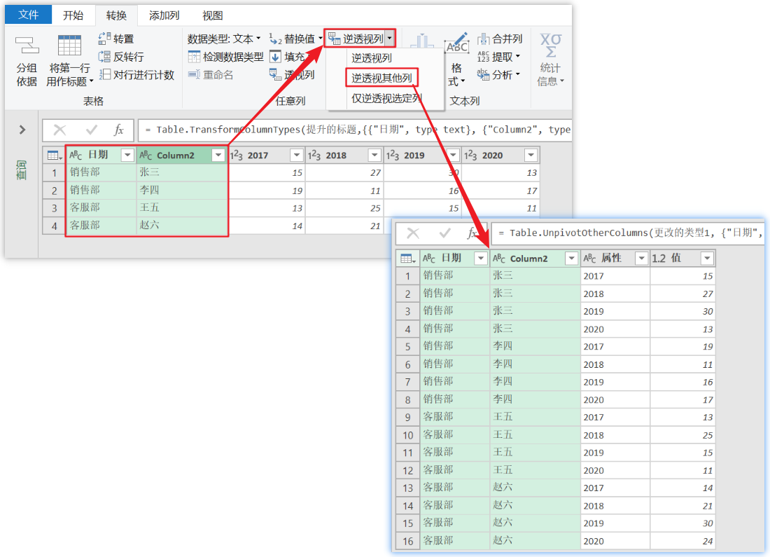 🔷然后选中前两列,进行逆透视即可完成转换。