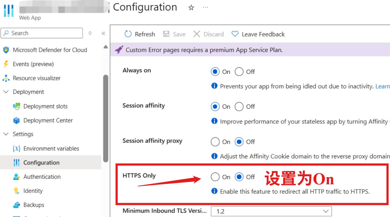 可以通过设置App Service只支持HTTPS访问来解决此问题。