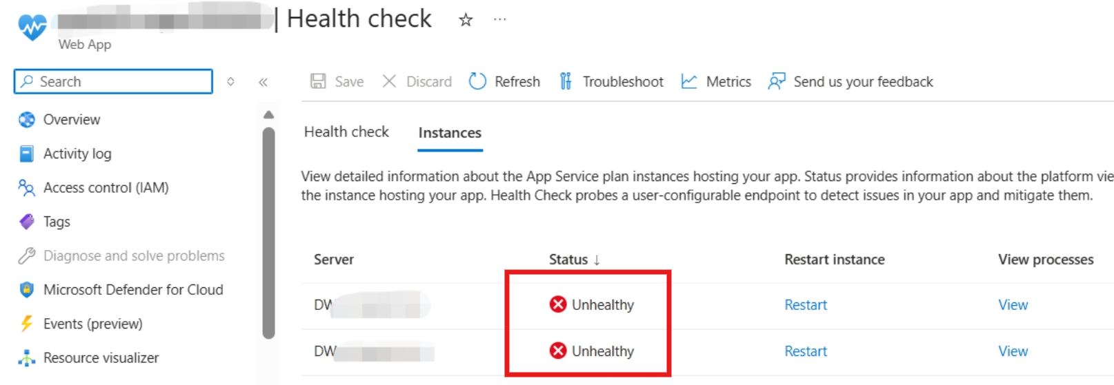使用App Service的Health Check功能,导致实例状态Unhealthy,重启也不能解决问题。