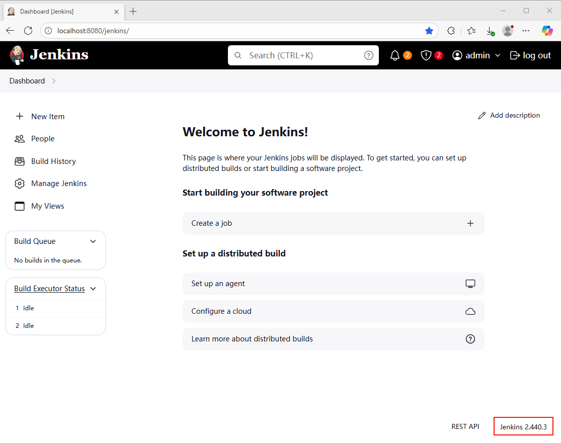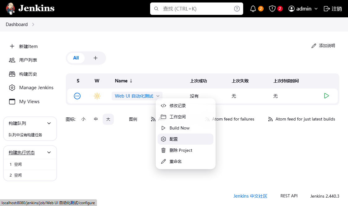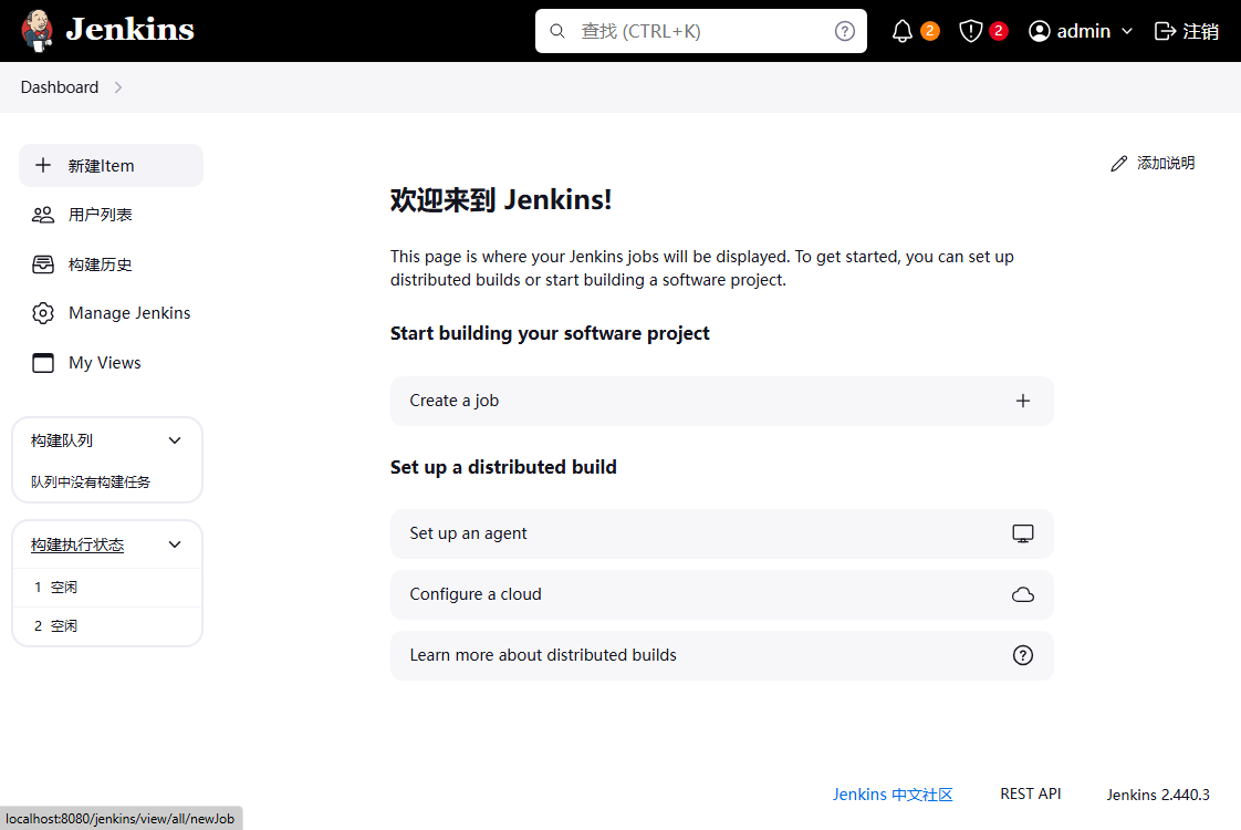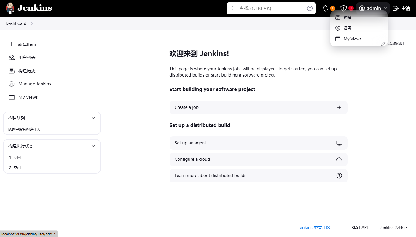 1、启动本地 Jenkins 服务,使用管理员账号密码登录(可自行更改密码);
