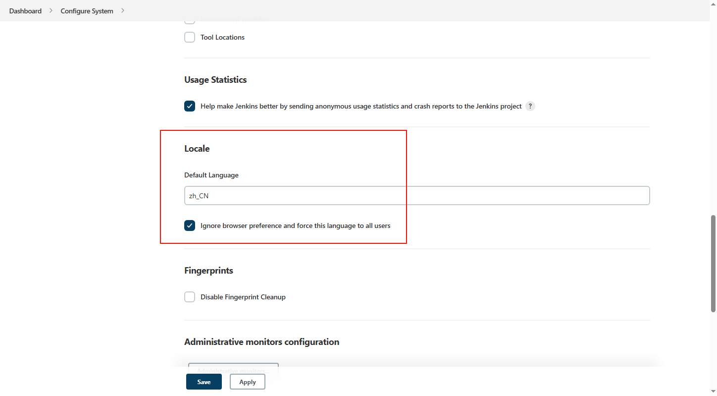 18、默认语言设置为"zh_CN",勾选"Ignore browser preference and force this language to all users",Apply 应用 → Save 保存;
