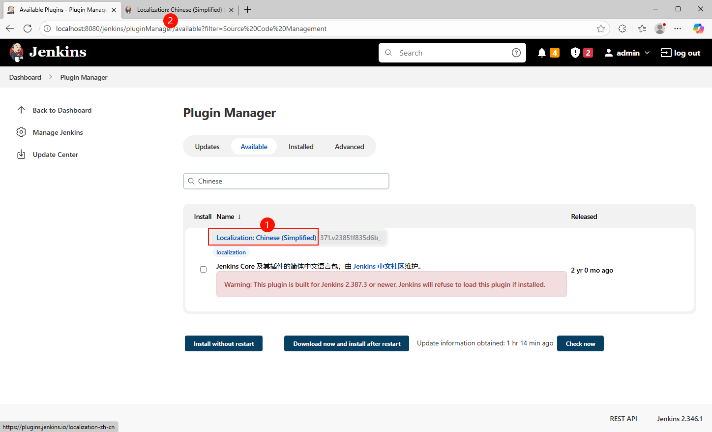 正常步骤是安装中文语言包插件,但是这里有警告信息,提示不支持当前 Jenkins 版本;