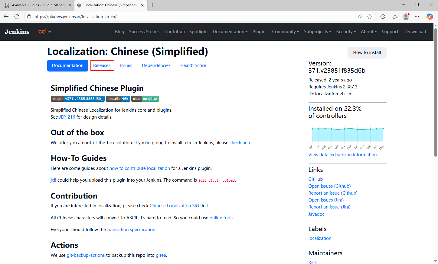 8、单击"Releases"按钮,选择更低版本的插件;