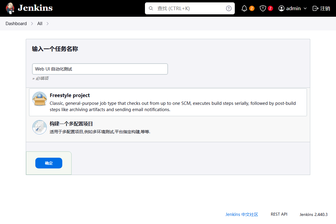 19、自定义名称 → 选择 构建一个自由风格的软件项目 → 单击"确定"按钮;