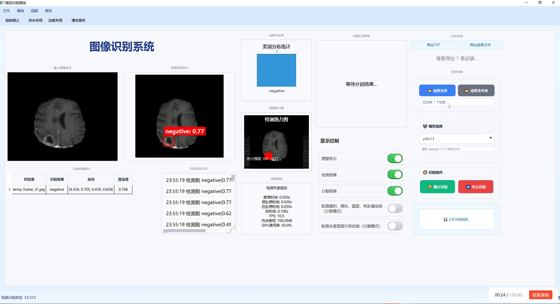 通过上图可以看到,系统成功识别了绝缘子上的缺陷,并用红色框标注了"negative: 0.77"(实际上应为缺陷类别及置信度)。中间区域显示类别分布统计和检测热力图,红色区域标记了缺陷位置。下方表格记录了识别结果,包括文件名、类别、坐标及置信度。右侧提供模型选择和显示控制选项,用户可以方便地调整参数和查看不同类型的检测结果。