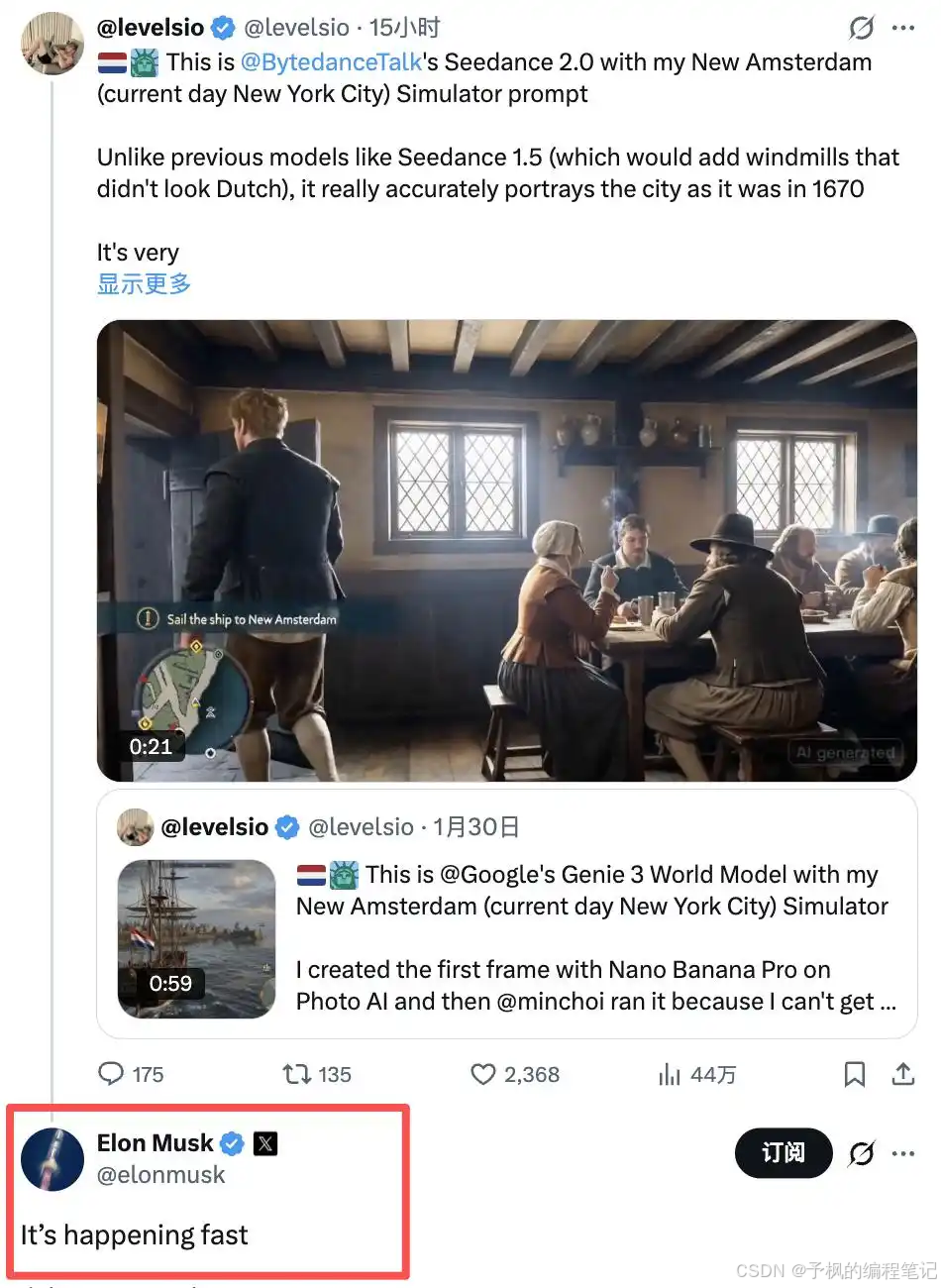 此外,Seedance 2.0 引入了"导演模式",允许用户通过自然语言精确控制镜头运动和角色一致性。该模型发布后迅速在社交媒体走红,埃隆·马斯克(Elon Musk)也在 X 平台上对此进行了评论,称其为"令人印象深刻的进展"。