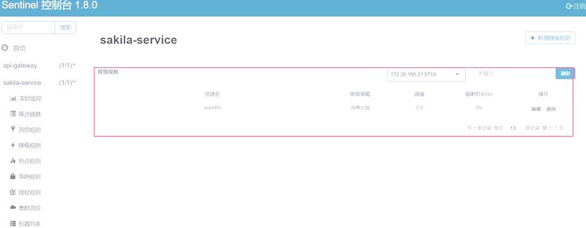 在sakila微服务的配置中,追加了一些关键数据源信息后,我们就可以在Sentinel控制台中进行规则的声明。在Sentinel控制台中设置限流规则为熔断降级,并确认规则在降级配置中体现。 点击sentinel控制台中的"编辑"按钮,可以查看熔断降级规则的详细配置信息。这里将rowCount设置为1的目的是使资源actorRS在调用时能够抛出异常,从而触发熔断机制。我们发现,在初始调用时,由于请求数未达到配置规则中的最小请求数(即3个),这将触发fallback方法。随着请求数的增加且异常持续抛出,熔断机制将启动,调用blockHandler中的方法以产生限流效果。