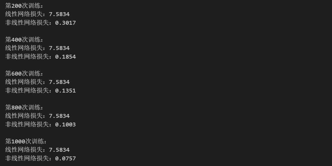 损失差异:训练1000次后,线性网络的损失(约0.5-0.8)远大于非线性网络的损失(约0.01-0.02)------说明非线性网络拟合得更好;