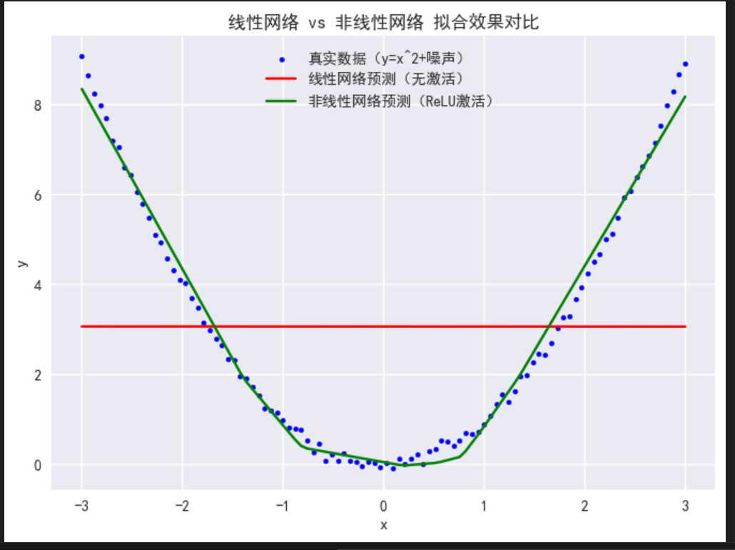 这就是最直观的证明:线性网络(无激活函数)无法拟合非线性数据,而加入非线性激活函数后,网络就能学习到数据的弯曲规律,拟合效果大幅提升。