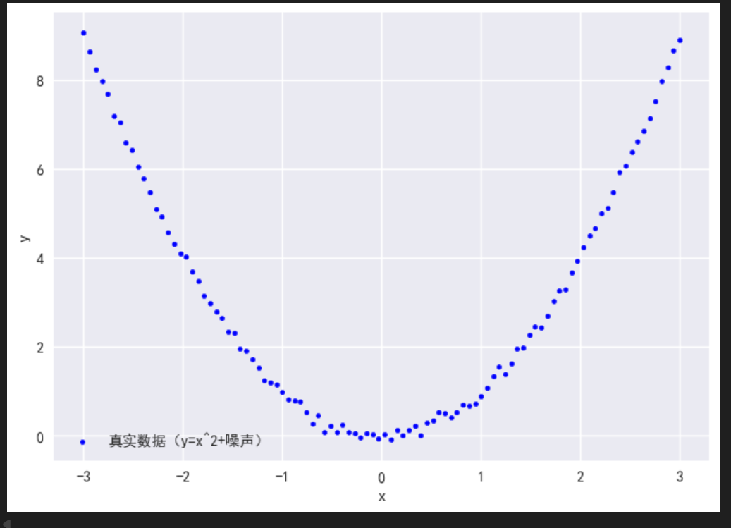 我们生成一组"y = x² + 随机噪声"的数据(典型的非线性关系),作为我们的训练数据: