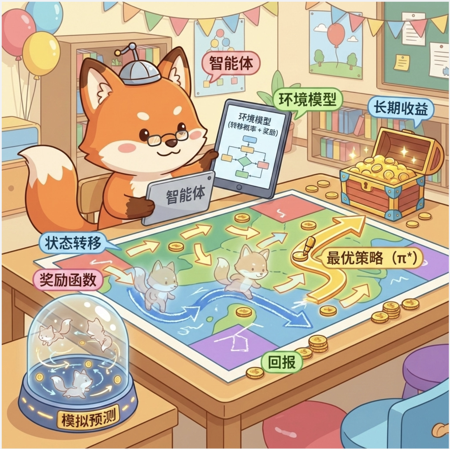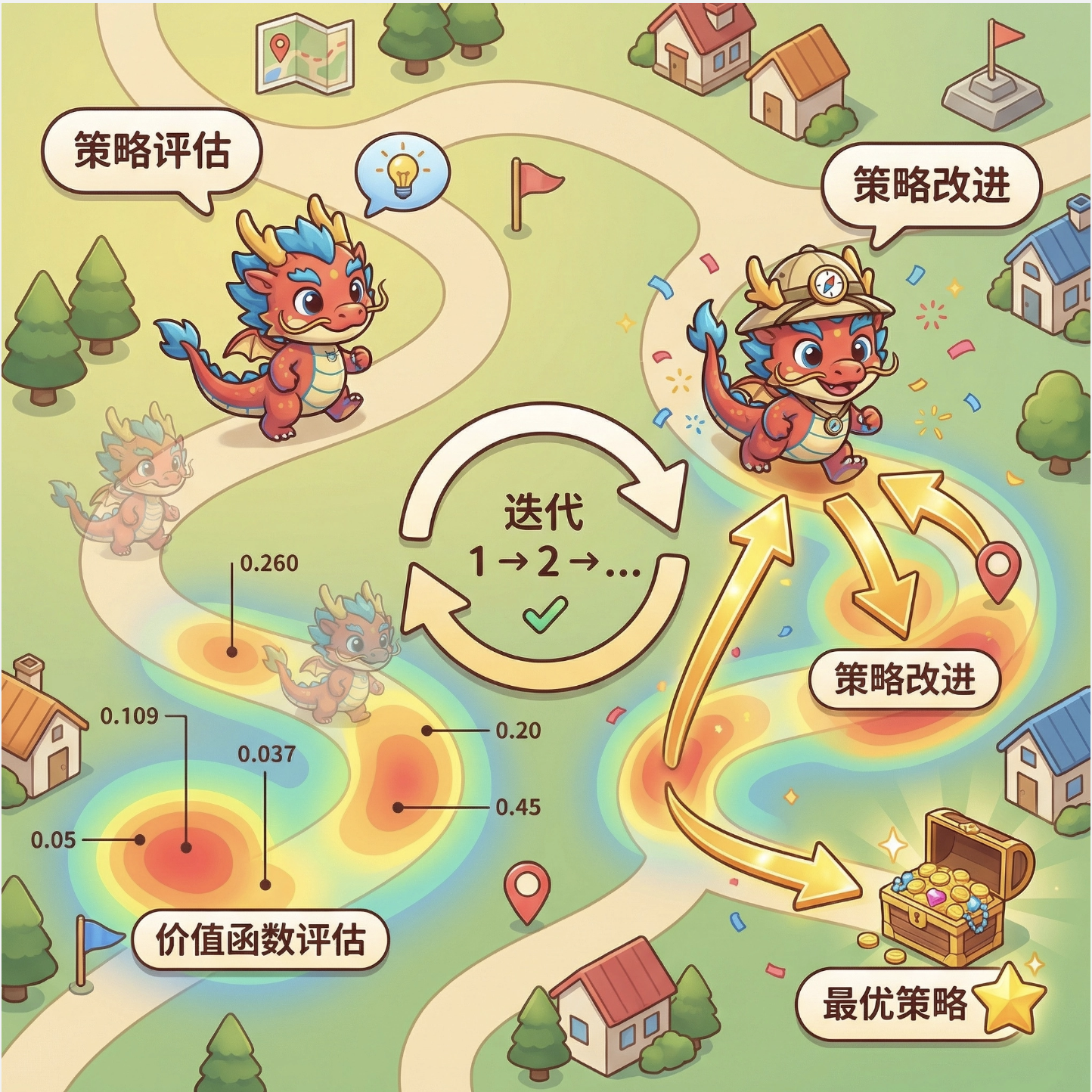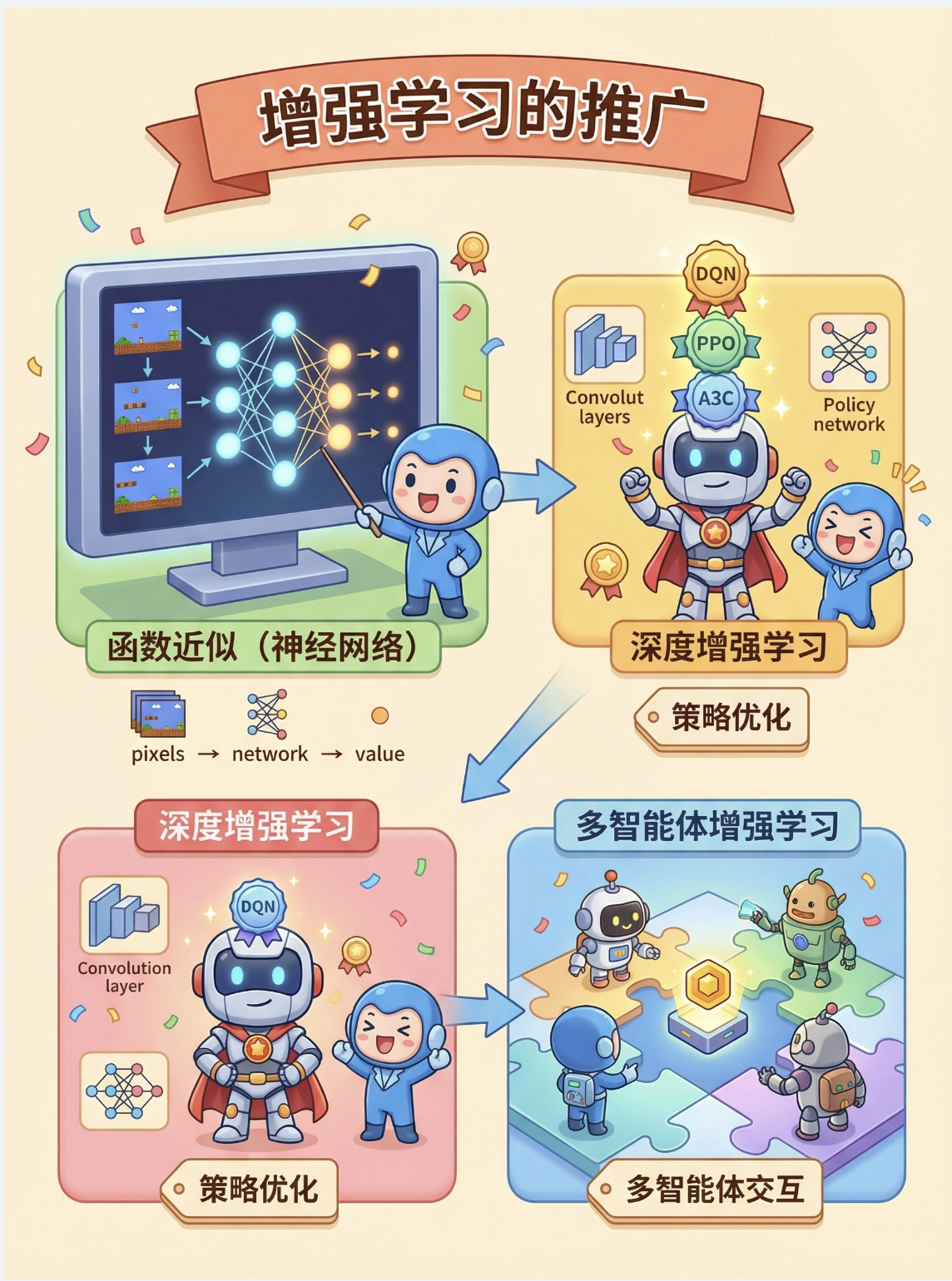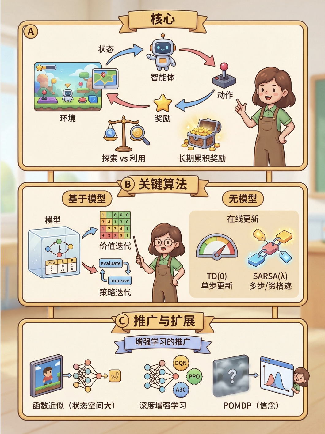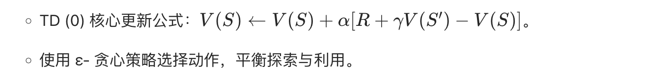 2.关键算法 :基于模型:价值迭代(更新价值→推导策略)、策略迭代(评估策略→改进策略)。无模型:TD (0)(单步更新)、SARSA (λ)(带资格迹,多步更新)。