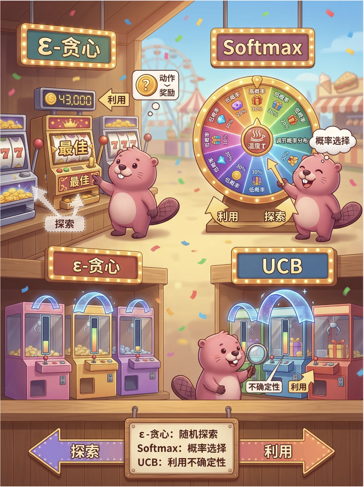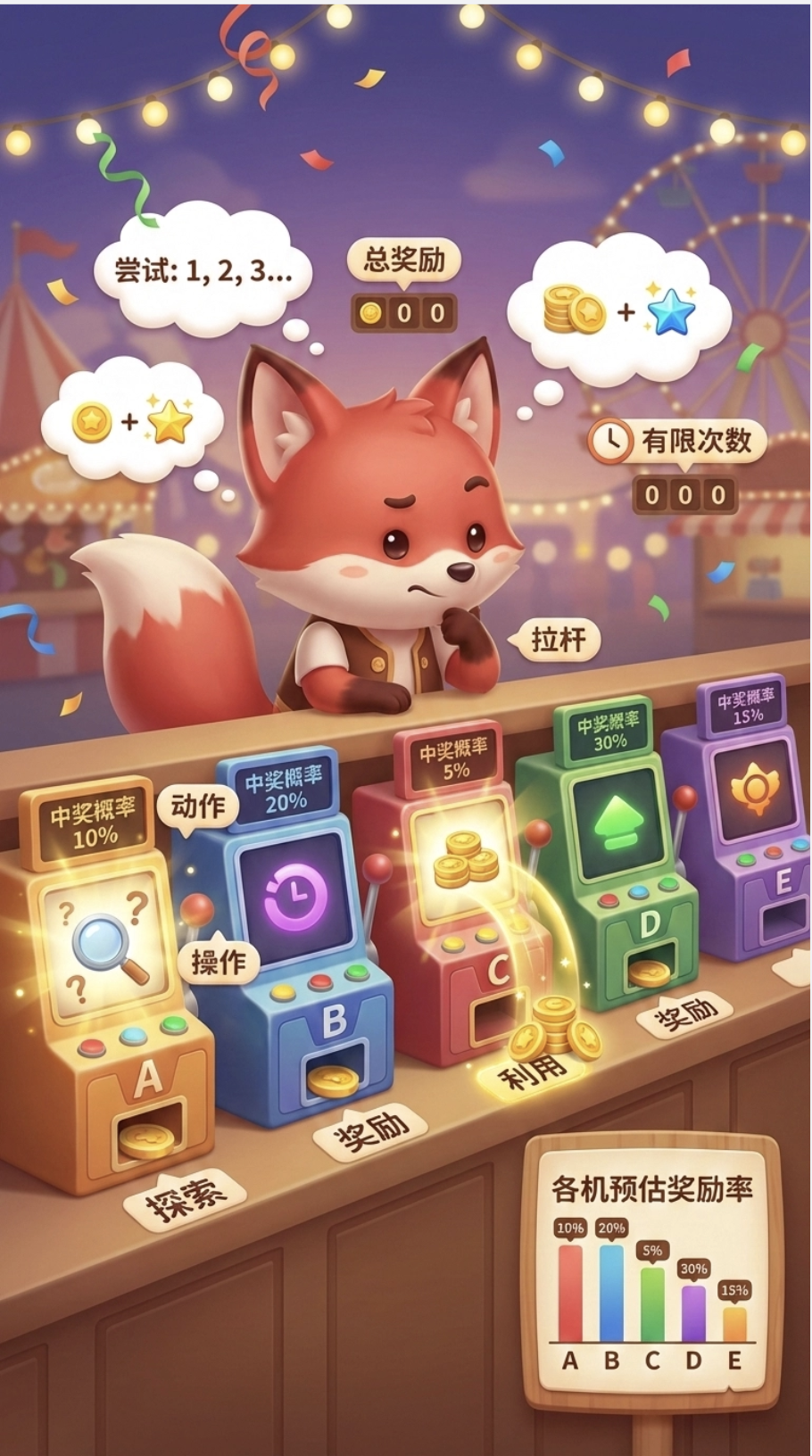 这就像你面前有 5 台老虎机,每台的中奖概率不同,你需要通过尝试找到中奖率最高的那台,同时还要兼顾尝试其他机器(防止错过更好的)。