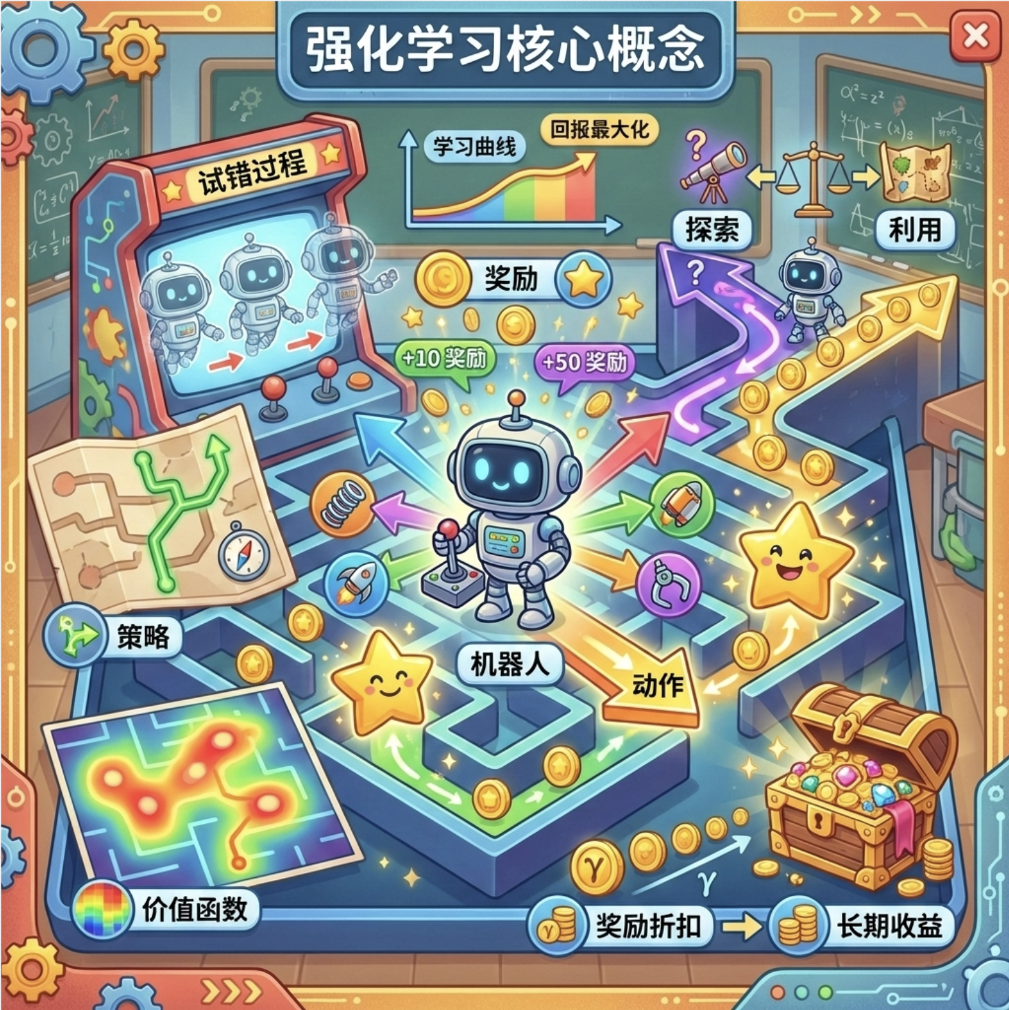 1.增强学习核心 :智能体通过与环境交互,在探索与利用之间平衡,最大化长期累积奖励。