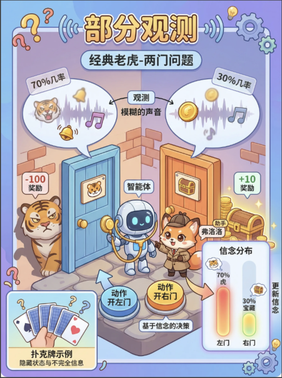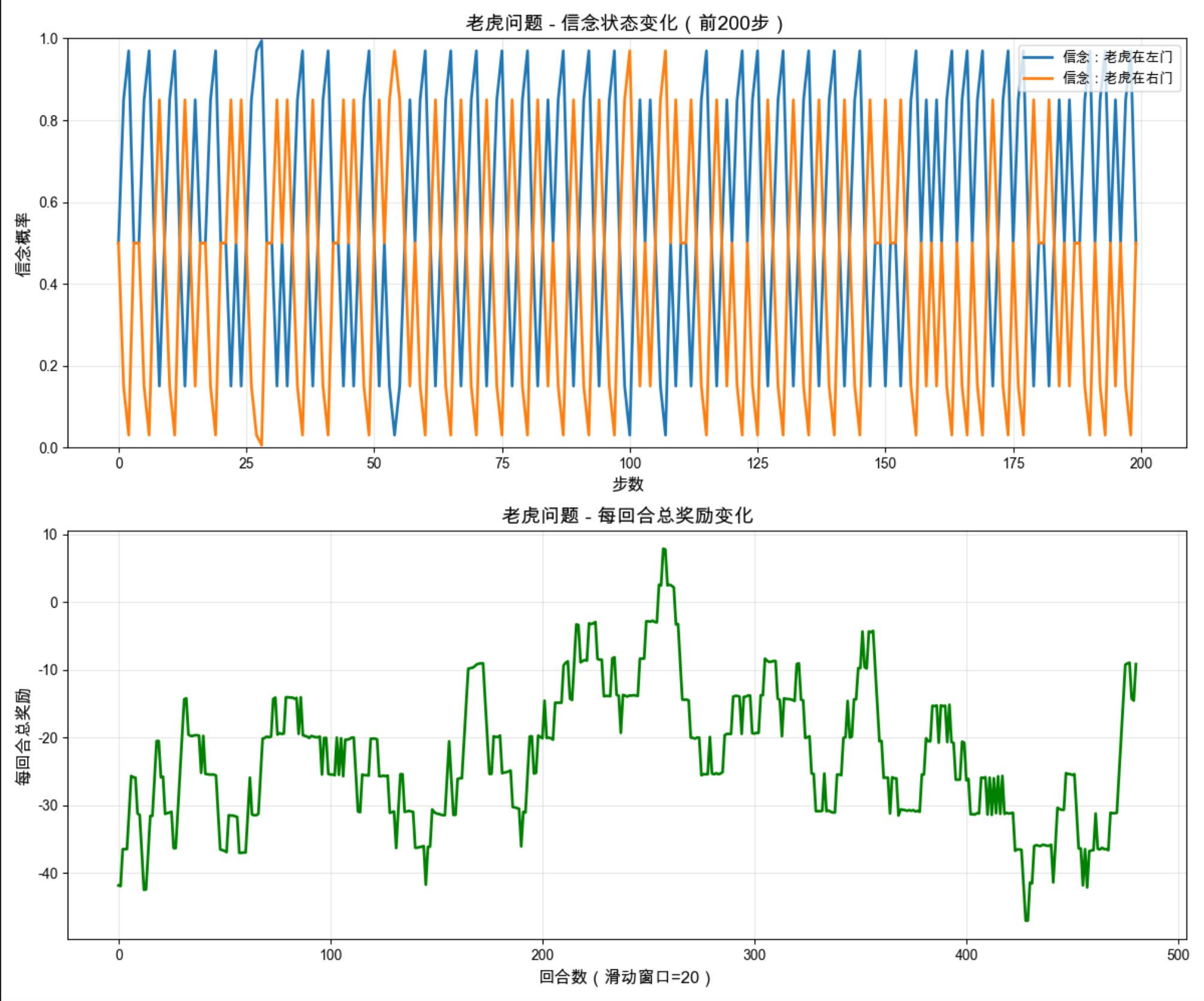 3.可视化 :信念状态曲线:展示智能体如何根据观测调整对老虎位置的判断。奖励曲线:奖励逐渐上升,说明智能体学会了先 "听" 再 "开门" 的最优策略。