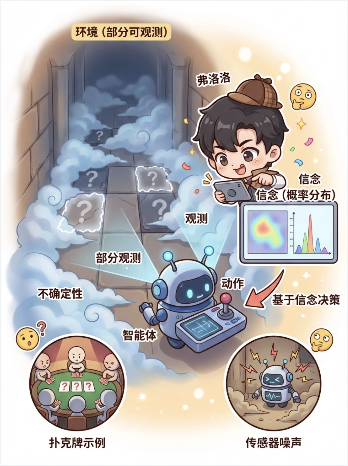 - POMDP 是 MDP 的扩展,处理部分可观测场景,核心是维护信念状态。