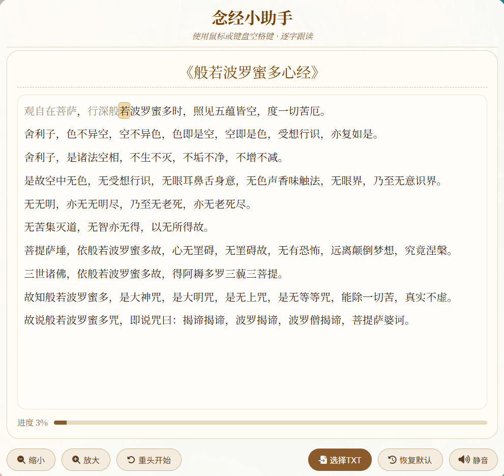 重置进度 :点击 "重头开始" 按钮,可将高亮位置快速重置到经文的第一个汉字。
