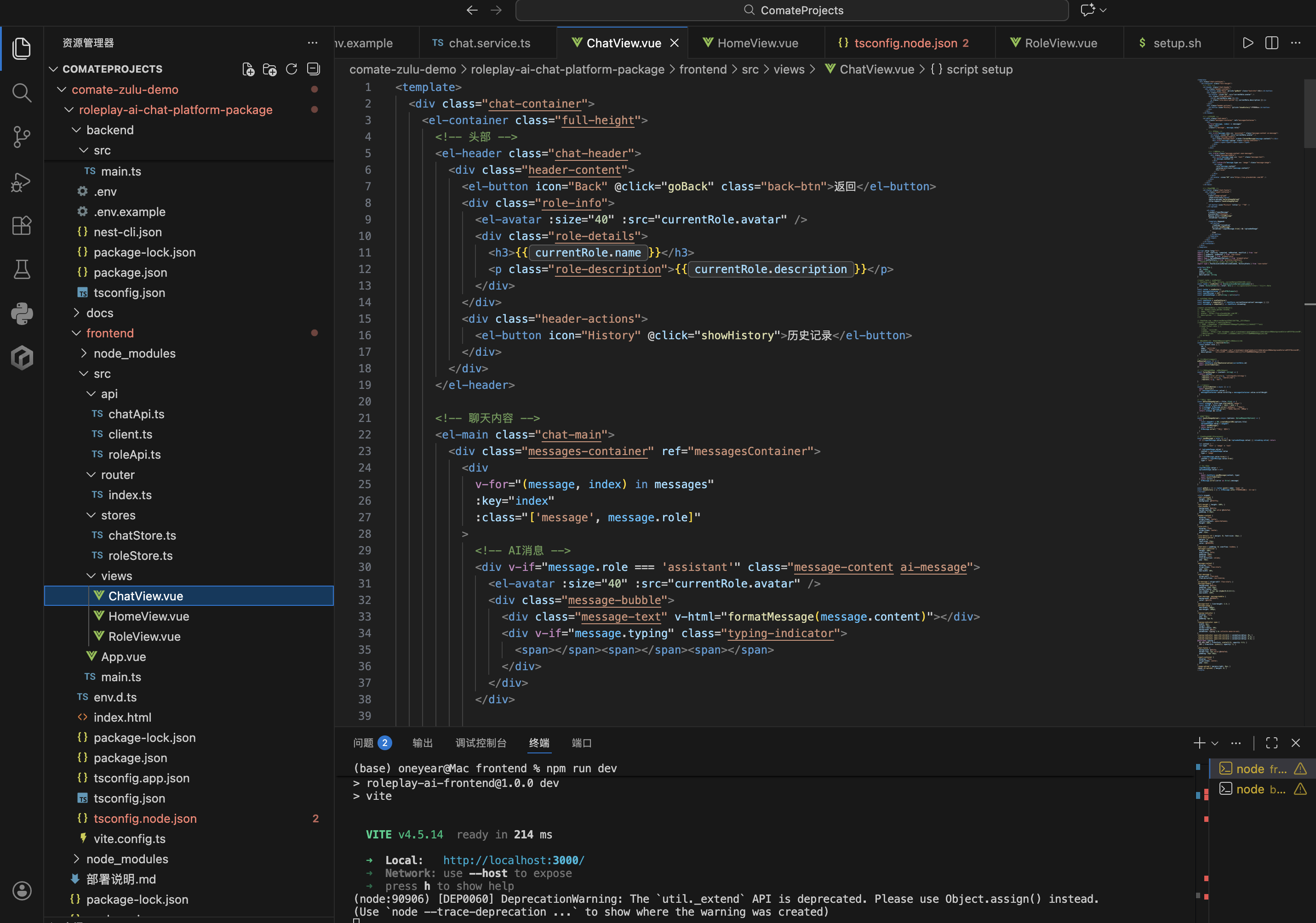 前端:用户在 ChatView.vue 发送消息 → chatApi.ts 发起 SSE 请求 → 前端监听 SSE 数据流,在 ChatView.vue 中逐字拼接消息并渲染,实现 "打字机" 效果 → chatStore.ts 维护流式消息状态,保证界面响应式更新。