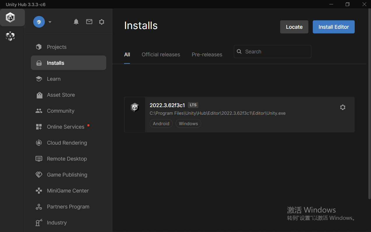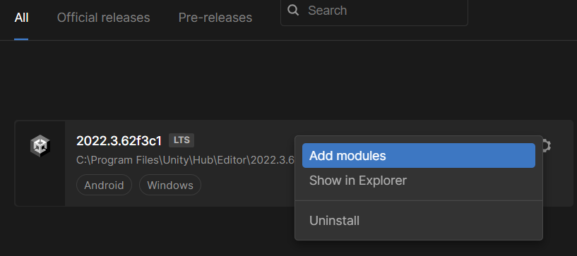 在左侧的Install栏内,可以看到目前安装的编辑器信息(版本号下方的Android和Windows表明它支持安卓和Windows)。点击齿轮图标------Add Modules(添加模组),可以安装所需的组件。