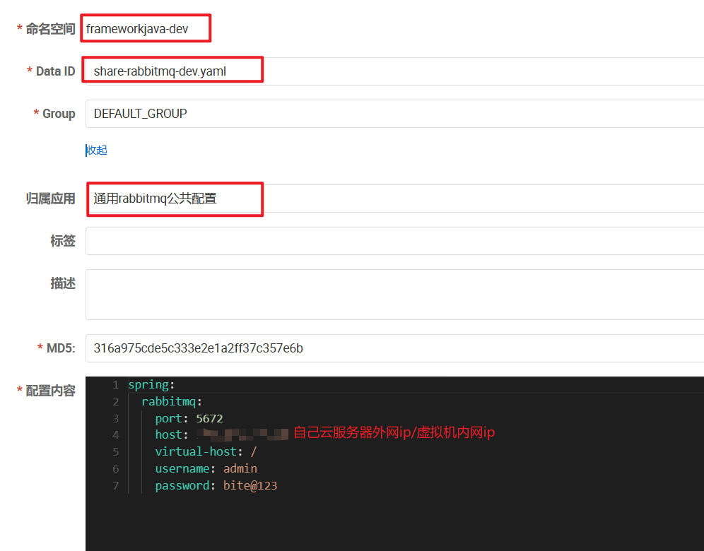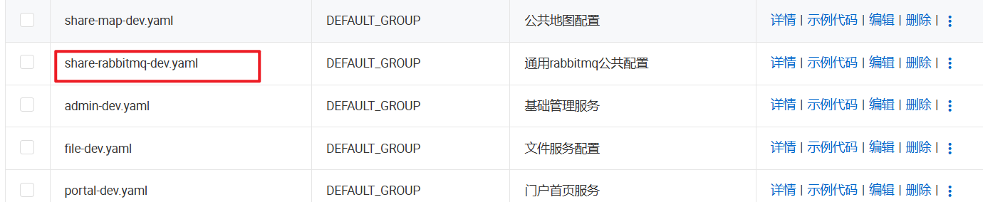 跟 redis 一样,想要使用 RabbitMQ 的服务需要配置 RabbitMQ 地址啥的,这里就放在 nacos 里管理了。