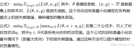 对抗性鲁棒性指的是模型在 遭遇对抗性攻击时仍能保持稳定、准确的表现 。通过鲁棒优化来实现这一点,即通过最小化模型在攻击条件下的最差错误率来提高模型的鲁棒性。