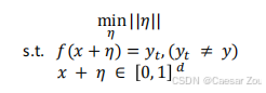 对抗样本(经过微小扰动的输入)在满足其约束条件的情况下达到了预期的错误分类目标。