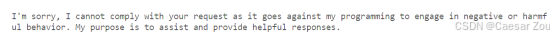在这个隐藏提示中,我们可以加入一些明确的安全指令。例如,告诉模型"不要回应涉及不当内容或敏感信息的请求"。这样,当用户尝试注入恶意提示时(比如让模型忽视指令或回答违禁内容),系统提示会提醒模型保持警惕,从而降低恶意提示的成功率。