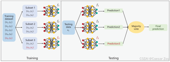 通过多个模型的"投票"来降低单个投毒样本的影响 训练多个模型时,每个模型使用的数据集都稍有不同,这些数据集是通过随机采样从原始数据集生成的。