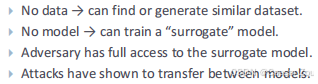 - 若攻击者没有模型访问权限,可以训练一个"替代模型"(surrogate model)来模拟目标模型的行为。