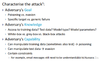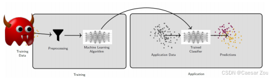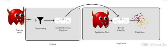 Two types of attacks: Evasion Attacks & Poisoning Attacks 规避攻击(后红魔,应用时攻击)和投毒攻击(前红魔,训练阶段就攻击)