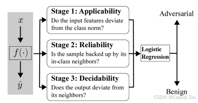 可判定性:球内标签的纯度------检查输出是否偏离了其邻居。也就是看样本所在的"球"区域内标签的纯度,如果标签不一致,说明样本可能为对抗样本。